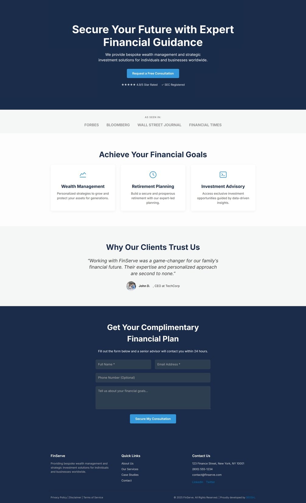 In the world of finance, trust is your most valuable asset. Yet, most financial firms operate with generic, insecure websites that fail to capture the interest of high-net-worth clients. Ad campaigns lead to unimpressive pages, and valuable leads are lost in a clumsy manual workflow.